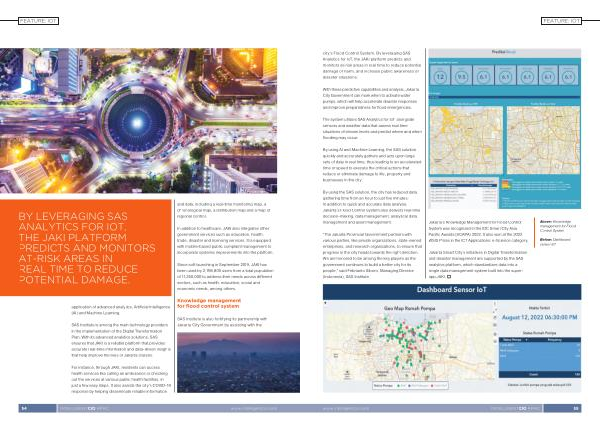 FEATURE : IOT city ’ s Flood Control System . By leveraging SAS Analytics for IoT , the JAKI platform predicts and monitors at-risk areas in real time to reduce potential damage or harm , and increase public awareness of disaster situations .