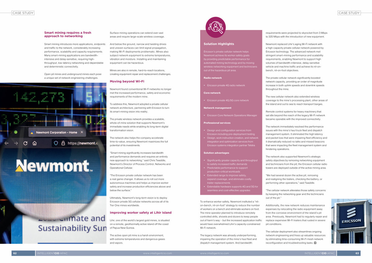 To address this, Newmont adopted a private cellular network architecture, partnering with Ericsson to turn its smart-mining vision into reality.